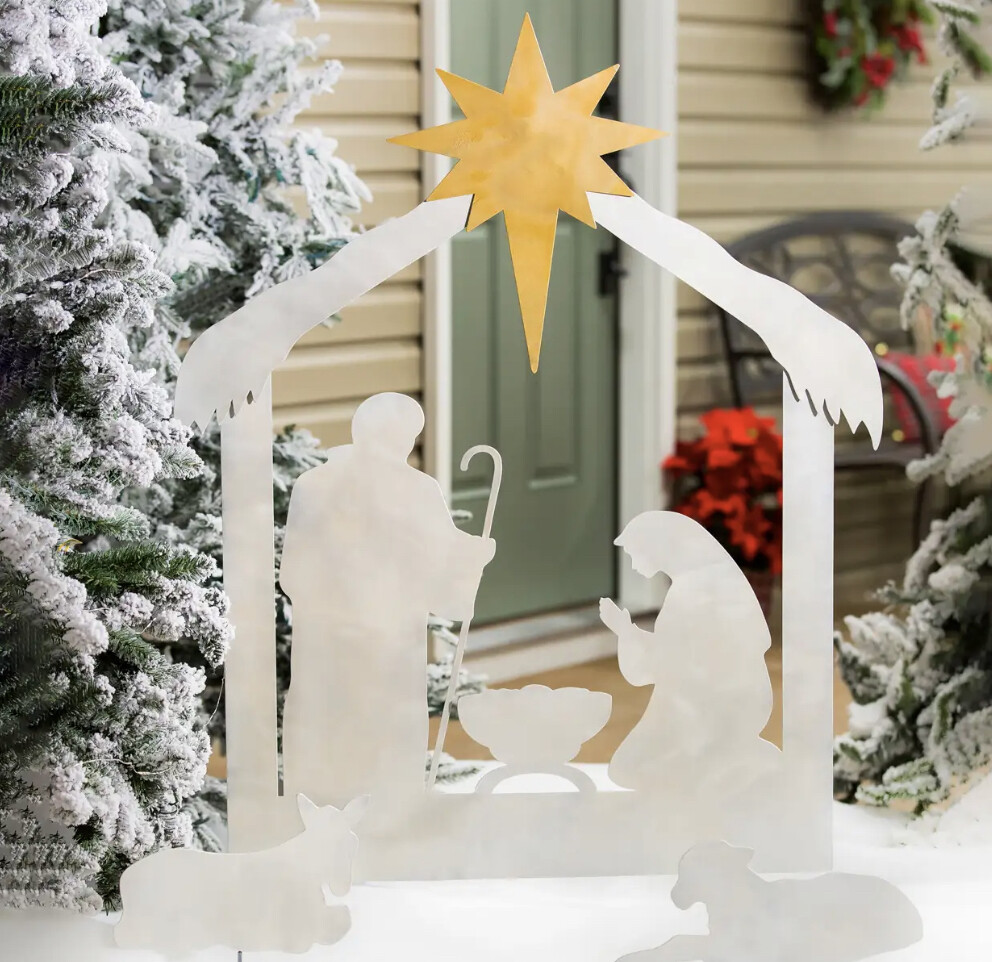 This stunning outdoor-safe nativity set celebrates the true meaning behind the Christmas season. It's the most wonderful time of the year! Crafted from laser-cut metal, the three-piece nativity yard scene is the perfect statement piece. The spirited designs can be easily inserted into the grass with their pronged stake bases. Includes 1 sheep, 1 donkey, and 1 Holy Family in the manger piece. Assembly is required.